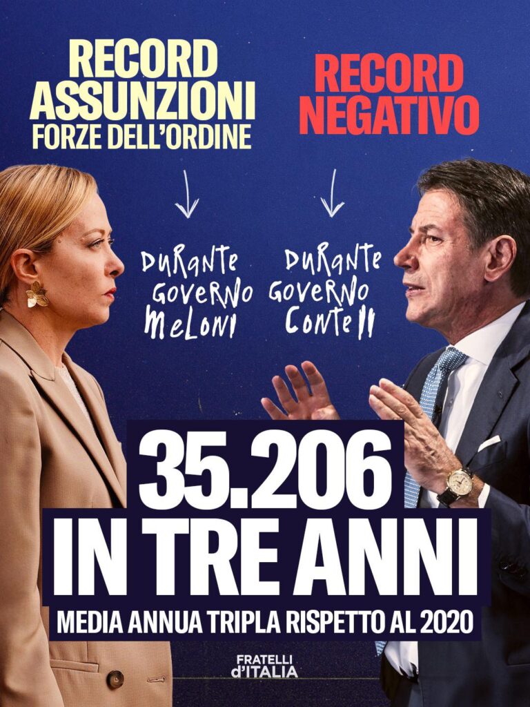 Record di nuovi agenti con il governo Meloni. I dati mettono la parola fine alle strumentalizzazioni di Conte e soci