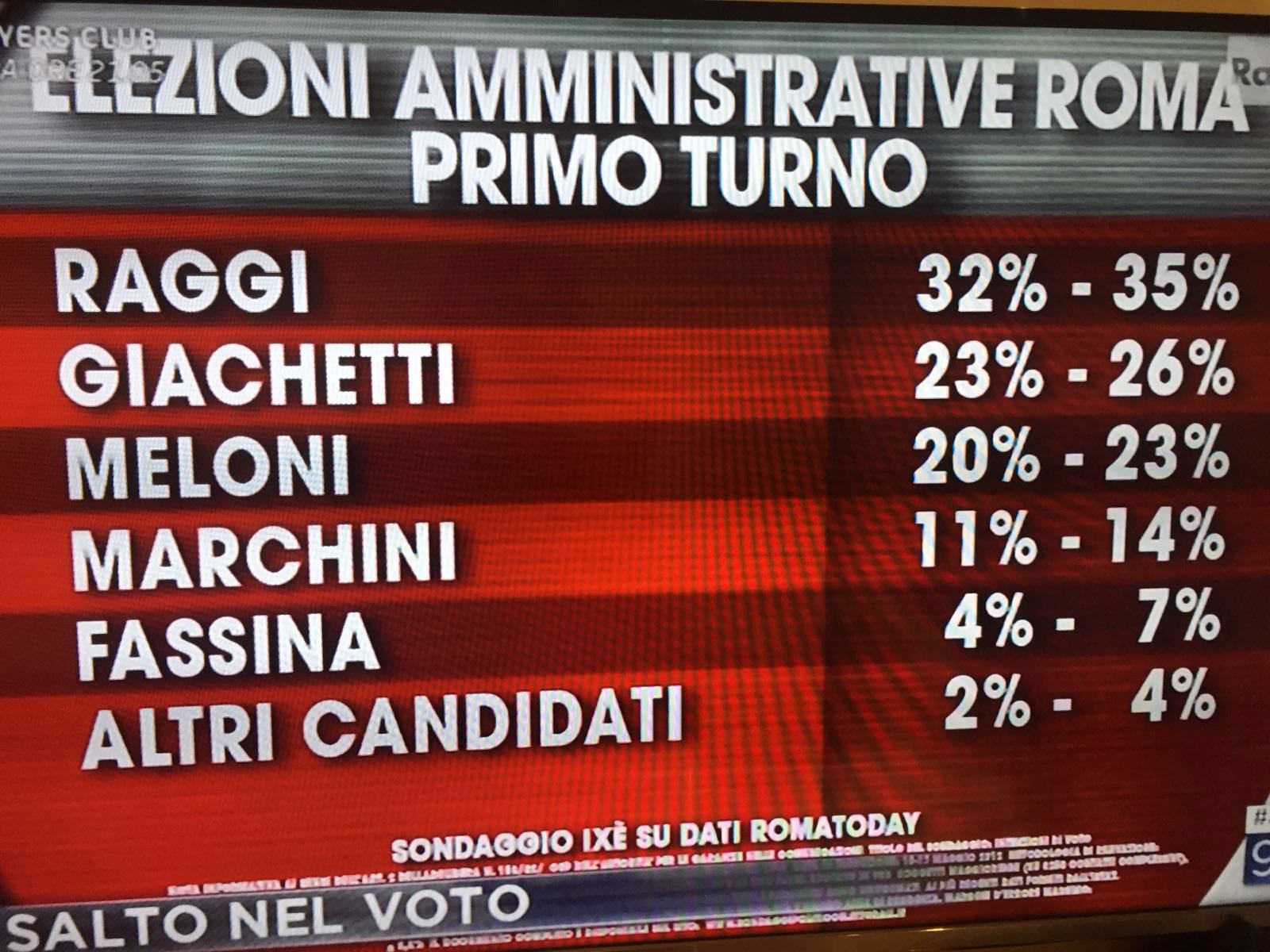 Numeri confermati dalla rilevazione Ixè per Agorà-Rai3: a Meloni è attribuita una forbice fra il 20 e il 23%, Marchini fra l’11 e il 14%.