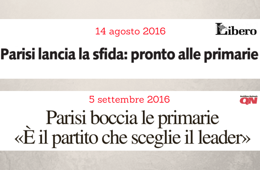 Appena tre settimane fa Stefano Parisi affermò che si sarebbe presentato ad eventuali primarie per scegliere il leader del centrodestra. Oggi, con una clamorosa retromarcia, le boccia senza indugi definendole “fonti di grandissime divisioni”. Parisi cambia rotta perché si sente crollare la terra sotto i piedi: le ambiguità sull’ipotesi di larghe intese per il post-referendum e le strizzate d’occhio alla Merkel che in Germania prende schiaffoni alle elezioni regionali gli stanno facendo perdere consenso. Le primarie hanno certamente dei limiti, ma i limiti delle decisioni prese da Arcore sono molto più evidenti: il centrodestra non potrà mai ripartire guardandosi indietro