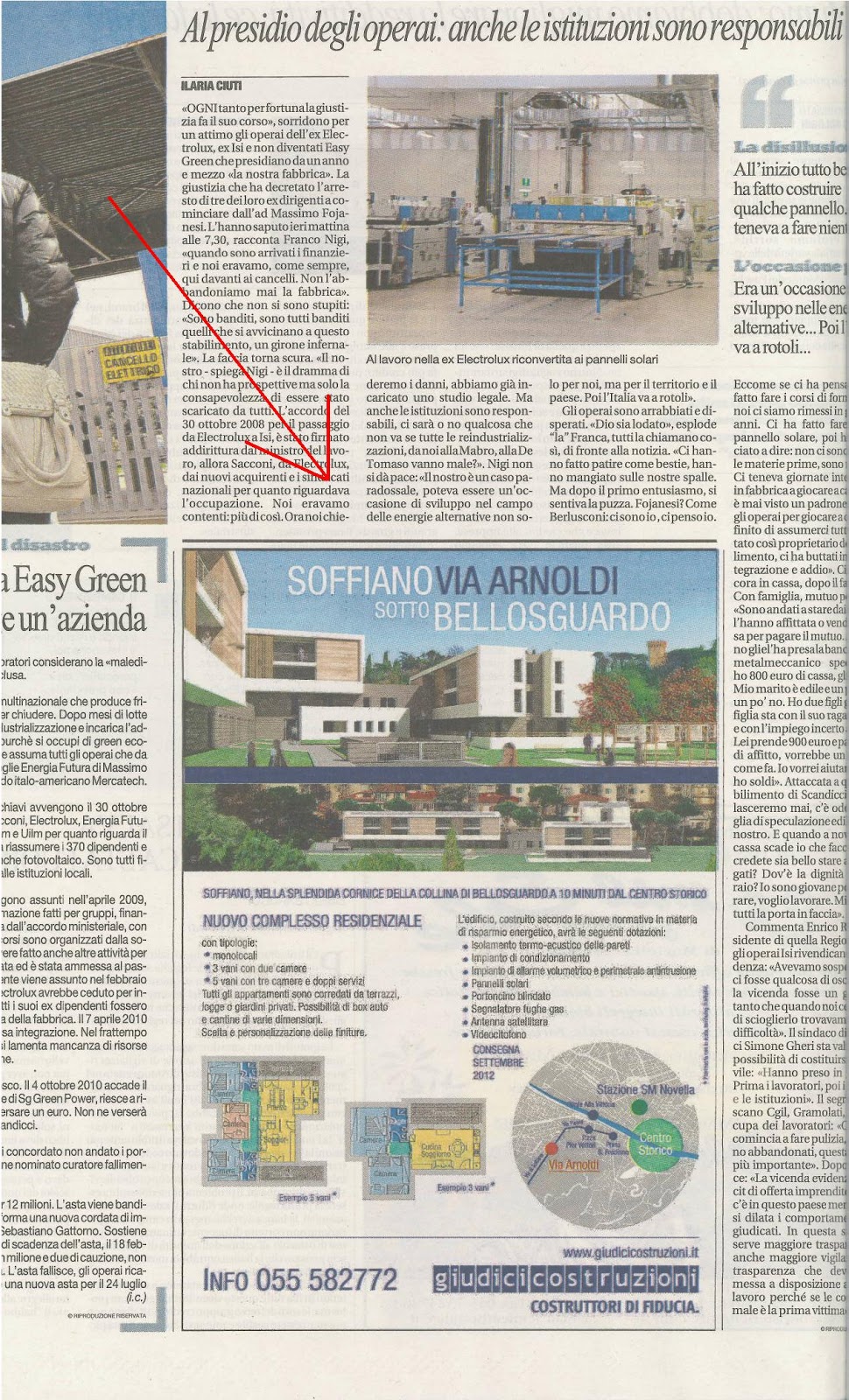 Oggi a pagina II della cronaca ho avuto una risposta. Nella seconda metà della pagina campeggia con tanto di foto e spiegazioni la pubblicità per la vendita degli appartamenti proprio all’interno di quell’intervento con ovviamente ben altre parole “Soffiano, nella splendida cornice della collina di Bellosguardo a 10 minuti dal centro storico”…