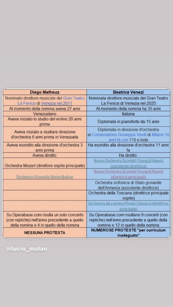 Mentre per la nomina di Beatrice Venezi a direttore musicale del Teatro La Fenice la sinistra è salita sulle barricate ritenendo il suo curriculum “non adeguato”, nel 2011 la nomina di Diego Matheuz, più giovane e con meno esperienza, non destò alcuna protesta.