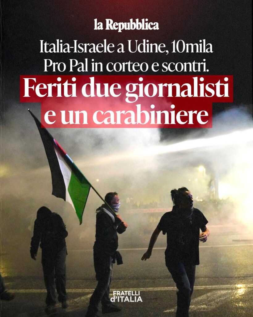 Sono sempre loro, i soliti facinorosi di estrema sinistra che, stavolta, volevano impedire che si giocasse la partita di qualificazione Italia-Israele. Fischi all’inno israeliano, seguito da una vera e propria sassaiola contro le Forze dell’Ordine, rimaste ferite: ecco le “pacifiche” manifestazioni difese dalla sinistra. Un augurio di pronta guarigione al Carabiniere ed ai giornalisti rimasti feriti e piena solidarietà a tutte le Forze dell’Ordine.