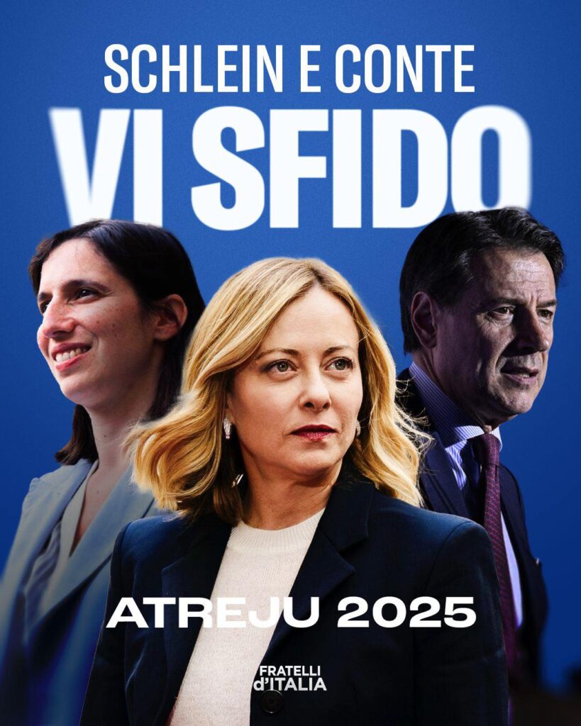 “Leggo che Elly Schlein avrebbe finalmente accettato l’invito di Fratelli d’Italia a partecipare ad Atreju, ma solo in caso di un confronto diretto con me. Atreju è sempre stata una casa aperta al dialogo, anche con chi la pensa diversamente. Sono quindi pronta a confrontarmi con l’opposizione. Ma ritengo che al confronto debba partecipare anche Giuseppe Conte.