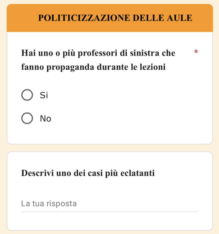 Ecco le “pericolose” domande degli studenti ai coetanei su cui la sinistra sta montando un caso sul nulla: “funziona il riscaldamento?”, “andate in gita?”. E poi la domanda dello scandalo “Ci sono prof di sinistra che fanno propaganda durante le lezioni?” Possibilità di risposta? “Sì o no”, “Descrivi uno dei casi più eclatanti”. Dove è la schedatura? Nessuno chiede nome e cognome, si chiede solo di raccontare se qualche prof è scorretto. E le prime risposte, pubblicate da Azione Studentesca, lo confermano.