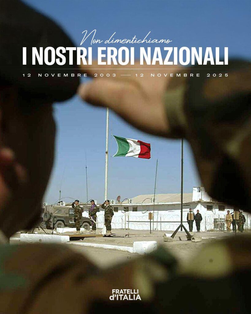 “Un giorno che ha segnato per sempre la storia del nostro Paese. Un dolore improvviso, profondo, che ha attraversato terre lontane per arrivare dritto al cuore dell’Italia. Diciannove italiani caddero a causa di un vile attentato, diciannove vite spezzate. Da allora, Nassiriya è divenuta un simbolo: di sacrificio, di servizio, di riflessione.