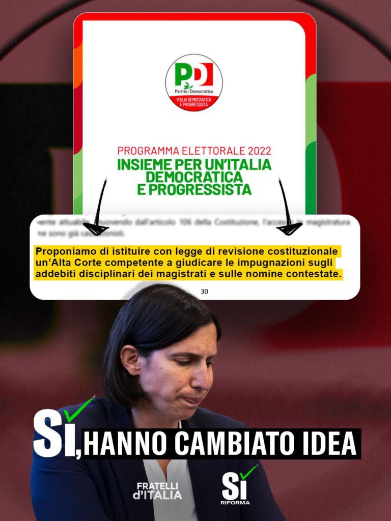 Mentre adesso attaccano in ogni modo la Riforma della Giustizia, alle elezioni del 2022 il Partito democratico presentò un programma elettorale in cui proponeva proprio una revisione costituzionale della giustizia. Infatti, nel loro documento si può leggere: “Proponiamo di istituire con legge di revisione costituzionale un’Alta Corte competente a giudicare le impugnazioni sugli addebiti disciplinari dei magistrati e sulle nomine contestate“.