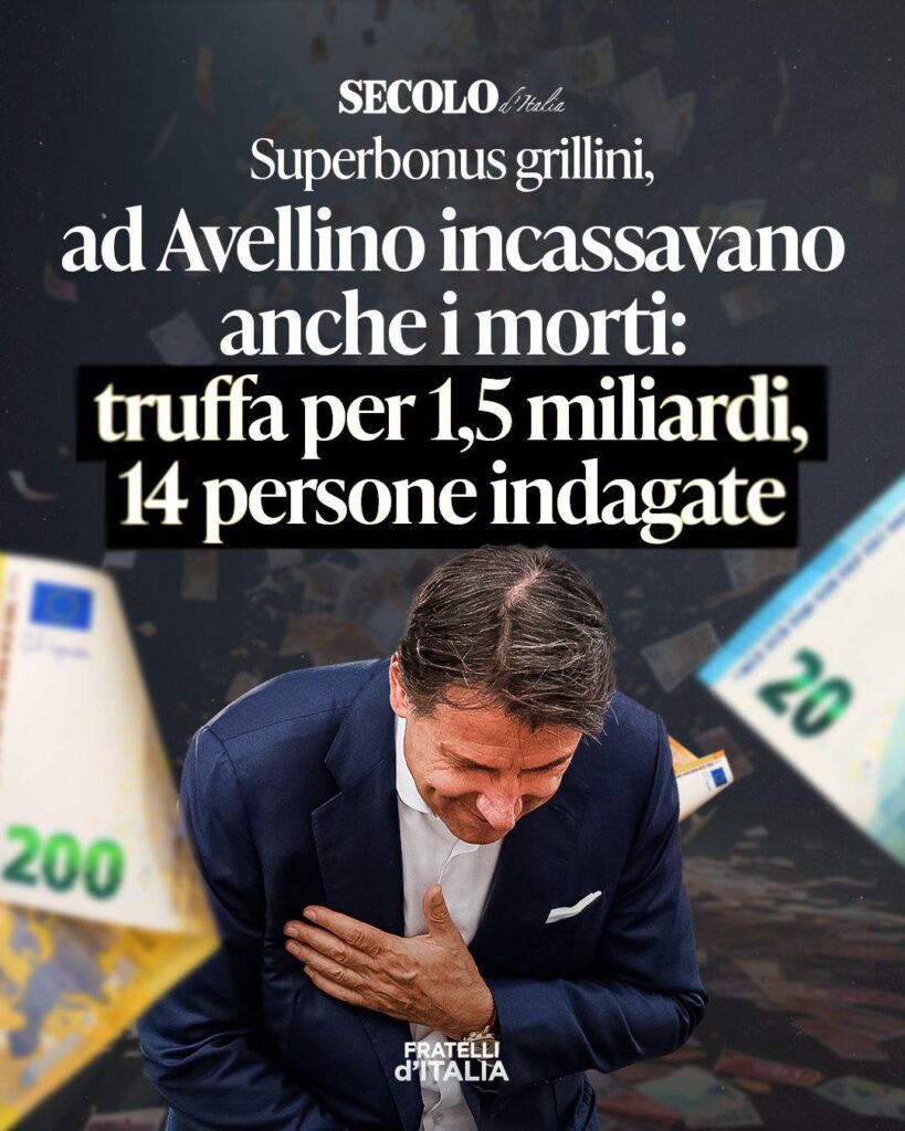 Il Superbonus di Conte continua a mostrare il suo vero volto: un colabrodo costoso, inefficiente e senza controlli. Ad Avellino incassavano contributi perfino a nome dei morti. Una truffa da 1,5 miliardi di euro: questa è l’eredità del “capolavoro” grillino. Mister “gratuitamente” ha consegnato alla Nazione un meccanismo che ha arricchito furbi, prestanome e organizzazioni criminali, scaricando poi il conto sugli italiani onesti. Zero verifiche, zero responsabilità, miliardi bruciati: la più grande falla della finanza pubblica degli ultimi anni. E continuiamo a pagarne le spese.